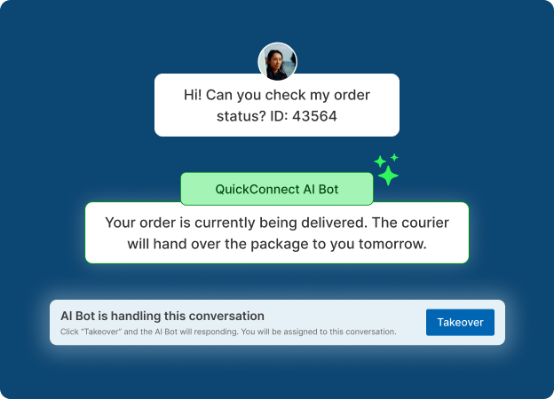 QuickConnect AI Bot connects with your business communication channels and uses your existing knowledge base, FAQs, and product information to deliver accurate and quick responses. It automates common interactions, shares product details, and even provides purchase links to help convert conversations into sales.