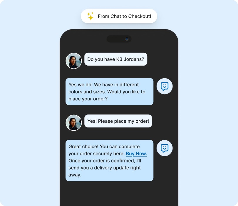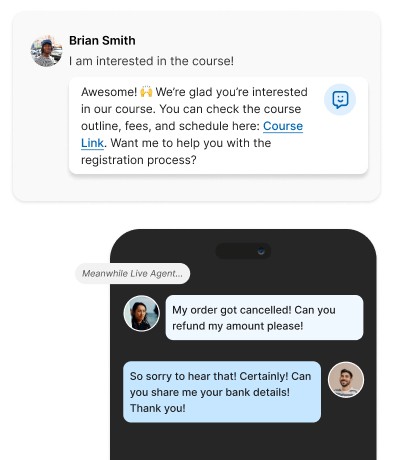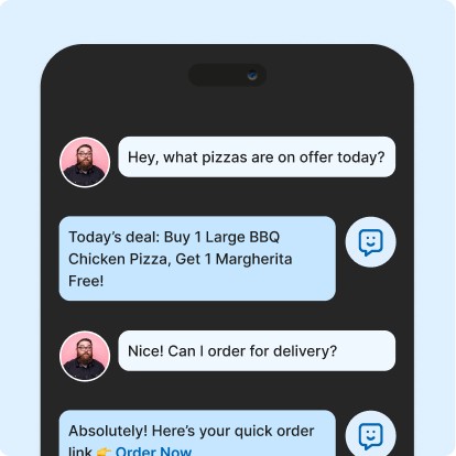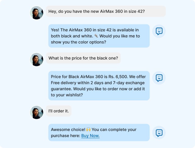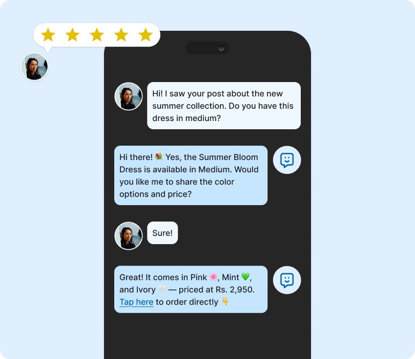 From Instagram DMs to WhatsApp chats, AI automatically shares product details, promotions, and purchase links—helping you close more deals.