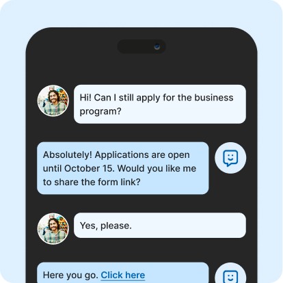 Reduce wait times with AI that uses your knowledge base and FAQs to provide reliable responses 24/7.