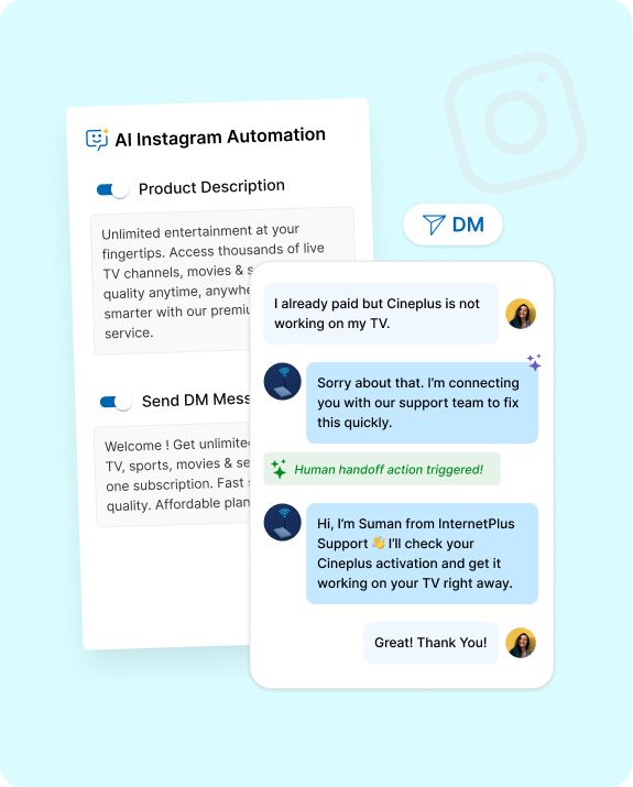 Unlike basic tools, QuickConnect Instagram Automation isn’t limited to rigid keyword rules. You simply describe your product or service, and the AI answers common customer questions in Instagram DMs.